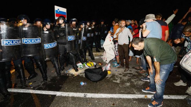 After a stand-off, Slovenian riot police used pepper spray against a crowd trying to cross the border on foot.